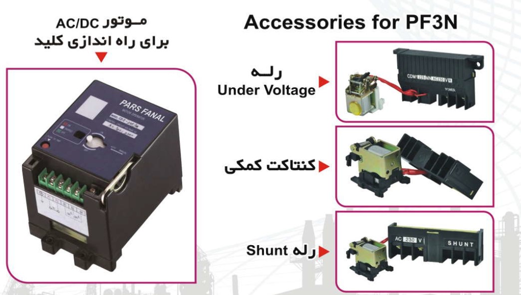 موتور الکتریکی پارس فانال از جمله تجهیزات جانبی کلیدهای اتوماتیک می باشد که به منظور شارژ (وصل) یا دشارژ (قطع) از راه دور کلیدهای اتوماتیک مورد استفاده قرار میگیرد.